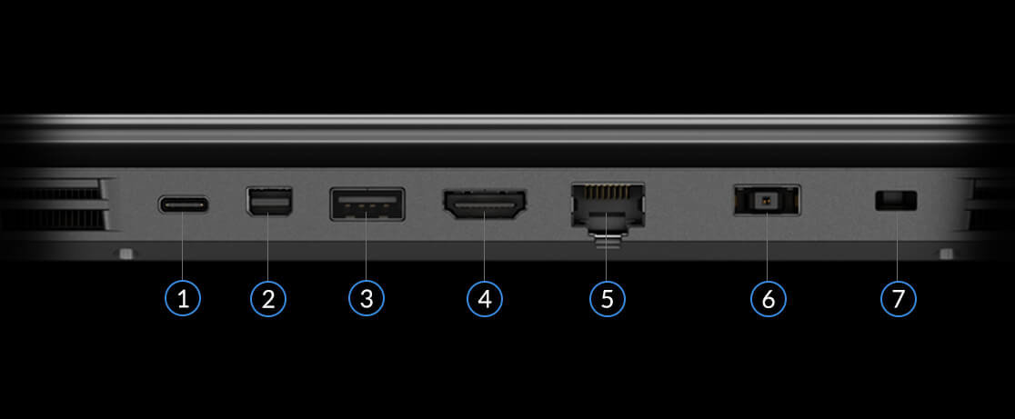 1. Port USB typu C | 2. Port Mini DP | 3. Port USB 3.0 | 4. Port HDMI | 5. Port RJ-45 | 6. Gniazdo zasilacza | 7. Gniazdo blokady Kensington