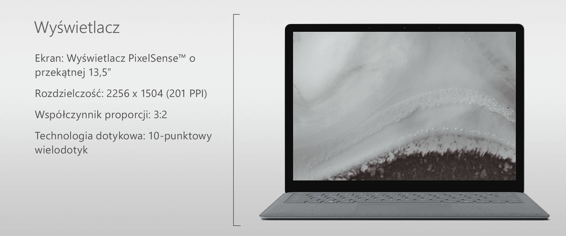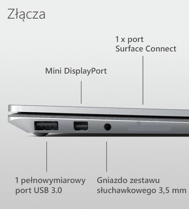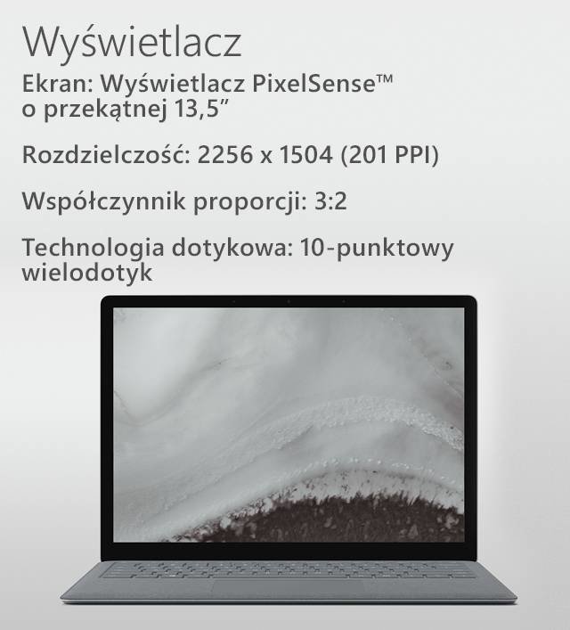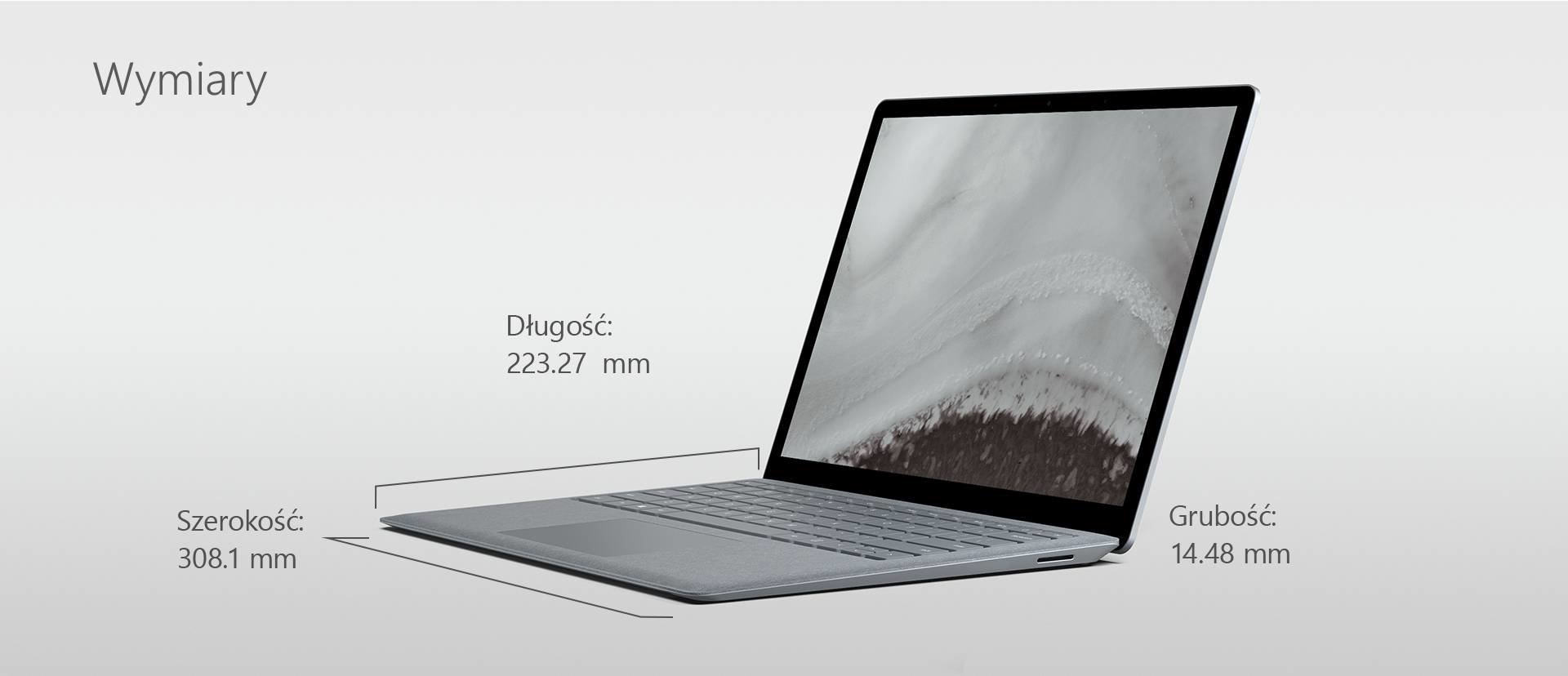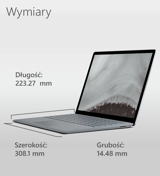 1 Surface Laptop 2: Do 14,5 godz. czasu pracy baterii przy odtwarzaniu filmów z lokalnego dysku twardego. Testy zostały przeprowadzone przez firmę Microsoft we wrześniu 2018r. z wykorzystaniem przedprodukcyjnej jednostki o parametrach Intel® Core™ i5, 256GB, 8 GB RAM. Test polegał na całkowitym rozładowaniu baterii podczas odtwarzania filmu. Użyto ustawień domyślnych, wyjątki: Nawiązano połączenie z siecią Wi-Fi i wyłączono automatyczne ustawianie jasności. Czas pracy baterii różni się znacząco w zależności od ustawień, sposobu użytkowania i innych czynników.
