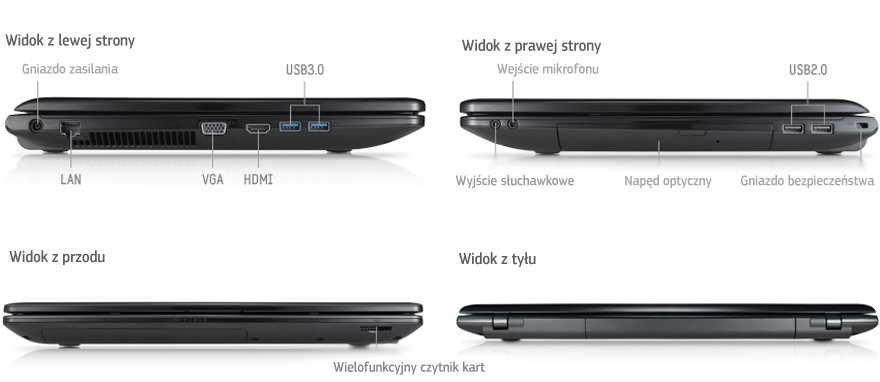 Szybko przesyłaj dane między notebookiem a zewnętrznymi urządzeniami z prędkością nawet do 5 Gb/s przez port USB 3.0, dziesięciokrotnie szybszy niż standardowy. Ponadto porty HDMI i VGA umożliwiają łatwe podłączenie do nowoczesnego telewizora lub dużego monitora, dzięki czemu będziesz oglądać filmy i zdjęcia na znacznie większym ekranie.