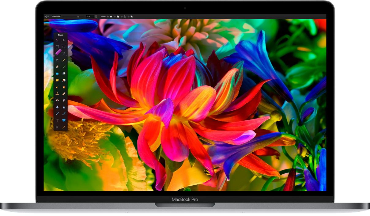 Żaden notebook Mac nie miał tak doskonałego wyświetlacza jak nowy MacBook Pro. Silniejsze podświetlenie LED i większy kontrast zapewniają głębsze czernie i czystsze biele. Większa powierzchnia użyteczna pikseli w połączeniu ze zmienną częstotliwością odświeżania zmniejsza zużycie energii. A wprowadzona po raz pierwszy w historii notebooków Mac szeroka gama kolorów pozwala wyświetlać intensywniejsze odcienie czerwieni i zieleni. Obrazy są dzięki temu jeszcze bliższe rzeczywistości i bogatsze w szczegóły. A to ma ogromne znaczenie w projektowaniu graficznym, korekcji barw i montażu wideo.