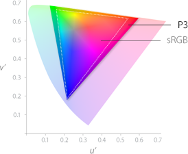 | Nowy MacBook Pro ma szeroką gamę kolorów (P3), która zawiera o 25% więcej barw niż standardowa paleta RGB. Dzięki temu wyświetla więcej odcieni zieleni i czerwieni. | ![]() |