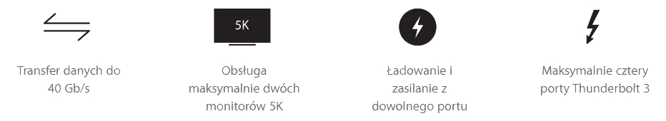 Thunderbolt 3 to udoskonalona wersja uniwersalnego portu, łączącego maksymalną przepustowość z niesamowitą wszechstronnością branżowego standardu USB-C. Przez jedno złącze przesyła energię do ładowania baterii oraz dane i wideo z prędkością nawet 40 Gb/s, czyli dwukrotnie szybciej niż Thunderbolt 2. W obu wersjach MacBooka Pro możesz mieć po cztery porty, dzięki czemu wszystko wygodnie podłączysz i z prawej, i z lewej strony. Także starsze urządzenia – przez odpowiedni przewód lub przejściówkę. Dodatkową zaletą Thunderbolt 3 jest obustronna wtyczka – nieważne, jak ją włożysz, zawsze będzie podłączona prawidłowo.