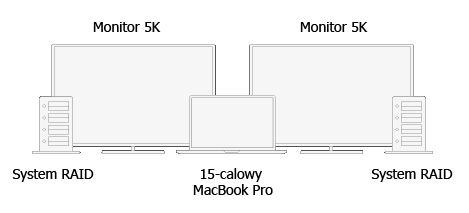 | Do 15-calowego MacBooka Pro z czterema portami Thunderbolt 3 możesz jednocześnie podłączyć dwa monitory 5K i dwa systemy RAID, tworząc potężną stację roboczą. | ![]() |