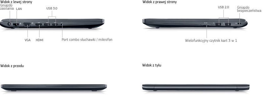 Mimo kompaktowego i przenośnego designu urządzenie jest wyposażone w szerokie możliwości łączności. Możesz szybko udostępniać dane przy użyciu 2 portów USB 3.0, 2 portów USB 2.0 oraz czytnika kart typu „3 w 1”. Pełnowymiarowe porty VGA, LAN oraz HDMI eliminują konieczność stosowania przejściówek.