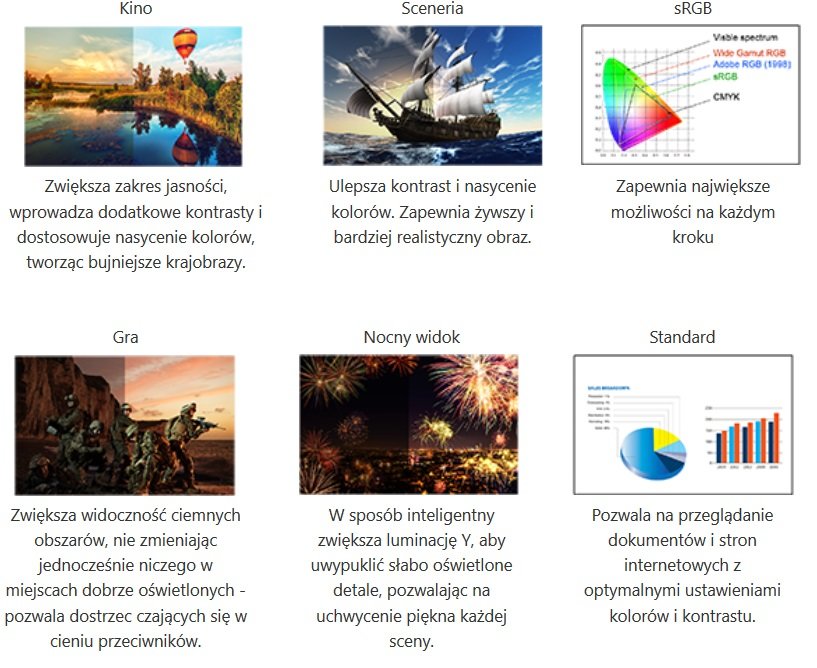 Technologia ASUS Splendid Video Intelligence to dostosowanie kolorów w jednym z sześciu gotowych trybów. Pozwalają one na łatwe dopasowanie ekranu do rodzaju wyświetlanych treści, uzyskując najlepszą wierność kolorów i jakość obrazu. Gotowe tryby wywołuje się odpowiednim skrótem klawiszowym.