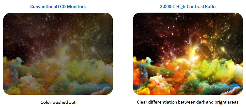 Najwyższy współczynnik kontrastu 3000:1 (ASCR 100 000 000:1) automatycznie zwiększa kontrast monitora regulując jasności podświetlenia, aby uzyskać najciemniejszą czerń i najjaśniejszą biel - zapewniając wyświetlanie realistycznego obrazu.
