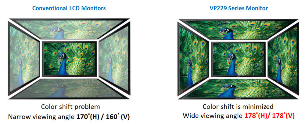 Seria VP229 została wyposażona w panel o szeroki kącie oglądania 178°, aby zminimalizować zmiany koloru, zapewniając lepsze wrażenia podczas oglądania