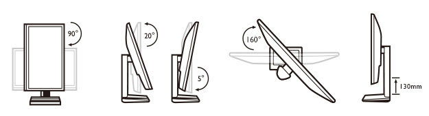 Szeroki zakres regulacji monitora - wysokość, pochylenie, pivot, swivel i skoku - teraz możesz dopacować najlepszą pozycje dla własnej unikalnej stacji roboczej, która jest najlepsza dla Twojego wzrostu i przyzwyczajeń z maksymalną odległoścą do 130 mm pomiędzy dolną krawędzią ekranu i podstawą.