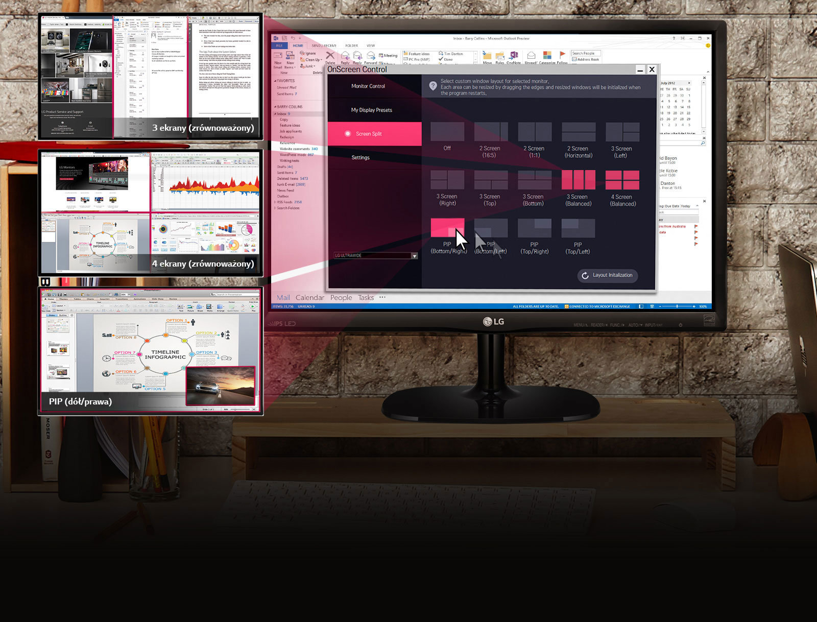 | Dostosuj swoje środowisko do pracy wielozadaniowej Funkcja Screen Split dzieli ekran przez zmianę rozmiaru okien, w których można wykonywać różne zadania. Tryb PIP umożliwia pracę i jednoczesne oglądanie filmu w okienku pływającym na ekranie. |