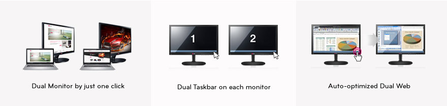 | Dual Smart Solution Funkcja ta pozwala w łatwy sposób rozszerzyć obraz na drugi monitor jednocześnie kopiując pasek zadań. Używając tego trybu do przeglądania stron internetowych można jednocześnie przeglądać dwa otwarte obok siebie okna przeglądarki. Każde z okien zostanie automatycznie dostosowane do wielkości połowy ekranu |