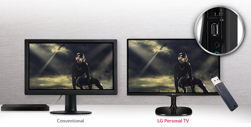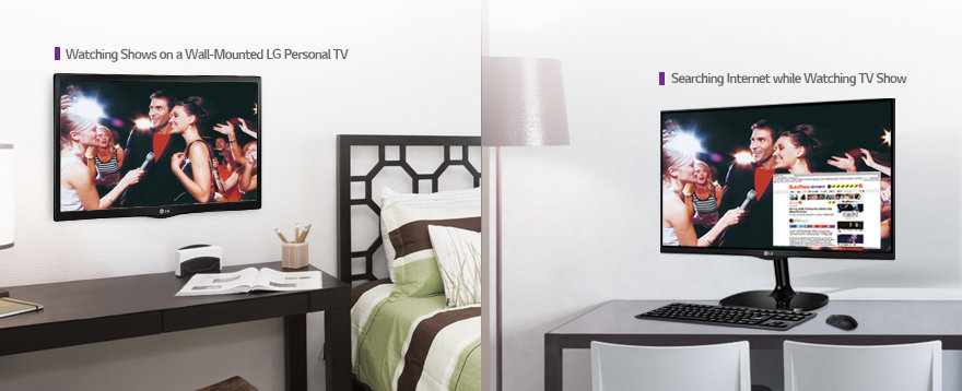 Wystarczy tylko jeden Osobisty LG TV by w zaciszu własnego pokoju oglądać telewizję i korzystania z monitora. Prócz oglądania TV, zapaleni użytkownicy internetu i fani filmu mogą używać go jak zwykły monitor. Dla maksymalnej wygody Osobosty LG TV można postawić na biurku lub zawiesić na ścianie.