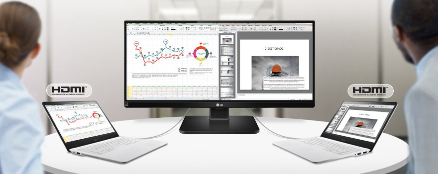 UltraPanoramiczny Full HD Ekran o proporcjach 21:9 jest idealnie dopasowany do potrzeb programistów, realizatorów obrazu i dźwięku jak również projektantów. Wyobraź sobie 2 tradycyjne, profesjonalne monitory połączone ze sobą tak by wspierać Twoją pracę. Niestety ich ekrany nigdy nie będą się stykać tak by całkowicie pobyć się rozdzielającej obraz ramki. Teraz możesz swobodnie korzystać z programów z naprawdę szerokim polem roboczym bez jakiekolwiek ramki po środku lub konieczności przesuwania okien kursorem. Już nie musisz dzielić swej uwagi między dwa oddzielne ekrany, LG UB55 stanie się Twoim najlepszym przyjacielem w realizacji celów zawodowych. * Wyświetlanie w proporcjach 21:9 lub rozdzielczości 2560 x 1080 może nie być dostępne z powodu niedostosowania pliku lub programu, samego urządzenia, używanego interfejsu lub ograniczeń karty graficznej. |