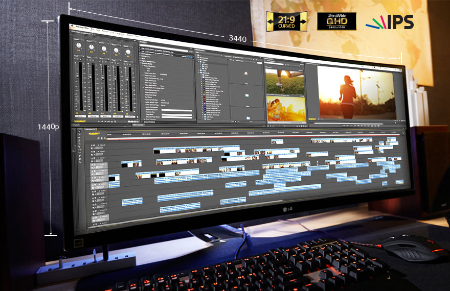 34UC97 to monitor z ogromnym zakrzywionym ekranem o rozdzielczości UltraWide QHD 3440x1440. Oznacza to, że monitor 34UC97 ma 2,4-krotnie większą powierzchnię niż monitor Full HD o formacie 16:9. Wyobraźmy sobie pojedynczy monitor, który ma o 20% pikseli więcej niż dwa postawione obok siebie monitory Full HD 16:9 , w dodatku bez ramki na samym środku obrazu. Obraz o tak dużej powierzchni nie musi być już podzielony na dwie części. Realizatorzy dźwięku mogą wyświetlać dłuższe sekwencje oraz większą liczbę ścieżek w oprogramowaniu Pro Tools, a tym samym uzyskują lepszy obraz nagrania. Montażyści mogą natomiast oszczędzić czas, ponieważ mogą łatwiej przełączać sekwencje w programie PremierePro. Ogólnie rzecz biorąc, większa powierzchnia ekranu pozwala na wygodne, jednoczesne wyświetlanie kilku narzędzi graficznych, miniaturek obrazów oraz stron internetowych. Ze względu na szeroki kąt widzenia 178, zakrzywiony panel IPS gwarantuje pełną widoczność całej powierzchni ekranu, bez martwych pól, co przekłada się na wyjątkowy komfort pracy. Ponadto, obraz na zakrzywionym 34-calowym panelu monitora 34UC97 całkowicie wypełnia pole widzenia, otaczając użytkownika obrazem. Atutem monitora jest też estetyczne wzornictwo, które pozwala w wyjątkowy sposób zmienić wygląd pomieszczenia, zarówno służącego do pracy, jak i przeznaczonego do rozrywki.