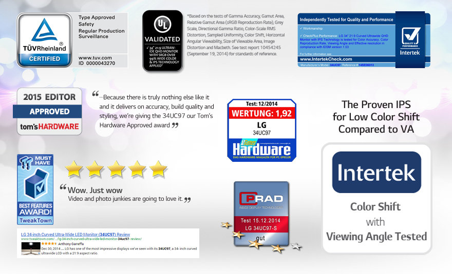 Monitor 34UC97 nieprzypadkowo otrzymuje nagrody i pozytywne recenzje za wysoką jakość obrazu. Został dokładnie przebadany przez cieszące się światowym uznaniem jednostki certyfikujące i uzyskał wysokie oceny. Certyfikaty przyznane przez laboratoria TÜV Rheinland, Intertek oraz UL potwierdzają wierność odwzorowania barw oraz szeroki kąt widzenia, zapewniane przez panel IPS, a także jego wysoką niezawodność. Jakość monitora 34UC97 została także zbadana i potwierdzona przez renomowane serwisy internetowe, takie jak TweakTown, który przyznał mu nagrodę Best Features Award, czy PRAD słynący z rygorystycznego testowania wyświetlaczy. Ponadto, parametry monitora 34UC97 zostały przetestowane i pozytywnie ocenione przez liczne media branżowe, takie jak Tom's HARDWARE, czy PC Games Hardware.Liczby oraz wykresy są jednoznaczne. Panel IPS firmy LG nie ma sobie równych pod względem wierności odwzorowania kolorów i ostrości obrazu, które nie ulegają pogorszeniu w szerokim zakresie kąta widzenia. Badania poziomu przesunięcia kolorów dla paneli VA oraz IPS przeprowadzone ostatnio przez Intertek wykazały, że w porównaniu do matrycy VA panel IPS wykazuje mniejsze przesunięcie barw (dla całej palety kolorów). Wyniki badań mówią same za siebie, potwierdzając przewagę monitora 34UC97 UltraWide z zakrzywionym ekranem.*Więcej informacji o nagrodzie Best Features Award przyznanej przez TweakTown: