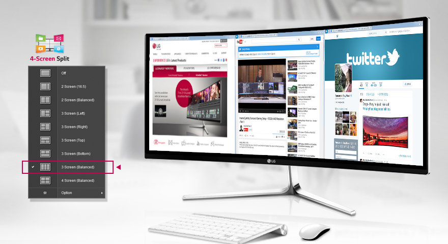 Duża powierzchnia ekranu monitora 34UC97 może stanowić wyzwanie dla naszej podzielności uwagi. Z tego powodu firma LG przygotowała kilka fabrycznie skonfigurowanych, łatwych do włączenia, ustawień podziału ekranu, które pozwalają na utrzymanie przejrzystego układu okien aplikacji. Dzięki takiemu rozwiązaniu można rozmieścić okna, tak aby nie nachodziły na siebie i maksymalnie wypełniały ekran, pozwalając na komfortową pracę wielozadaniową, np. jednoczesne wyszukiwanie zdjęć w Internecie, retuszowanie ich w programie Photoshop oraz przeciąganie gotowych ilustracji do prezentacji PowerPoint.