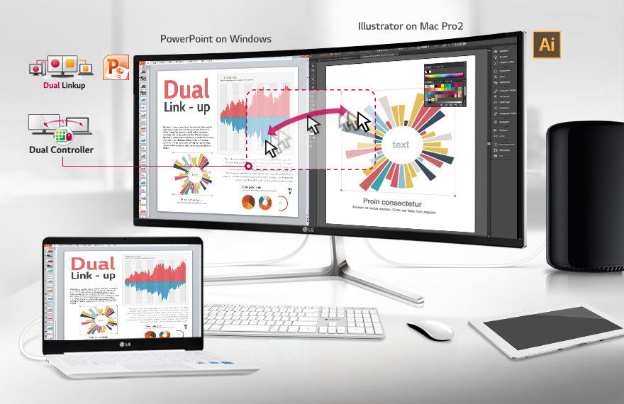 DZIĘKI FUNKCJI DUAL LINK UP ORAZ OPROGRAMOWANIU DUAL CONTROLLER, PRACA Z DWOMA URZĄDZENIAMI NIE ZMUSZA JUŻ DO UŻYWANIA DWÓCH ODDZIELNYCH MONITORÓW.