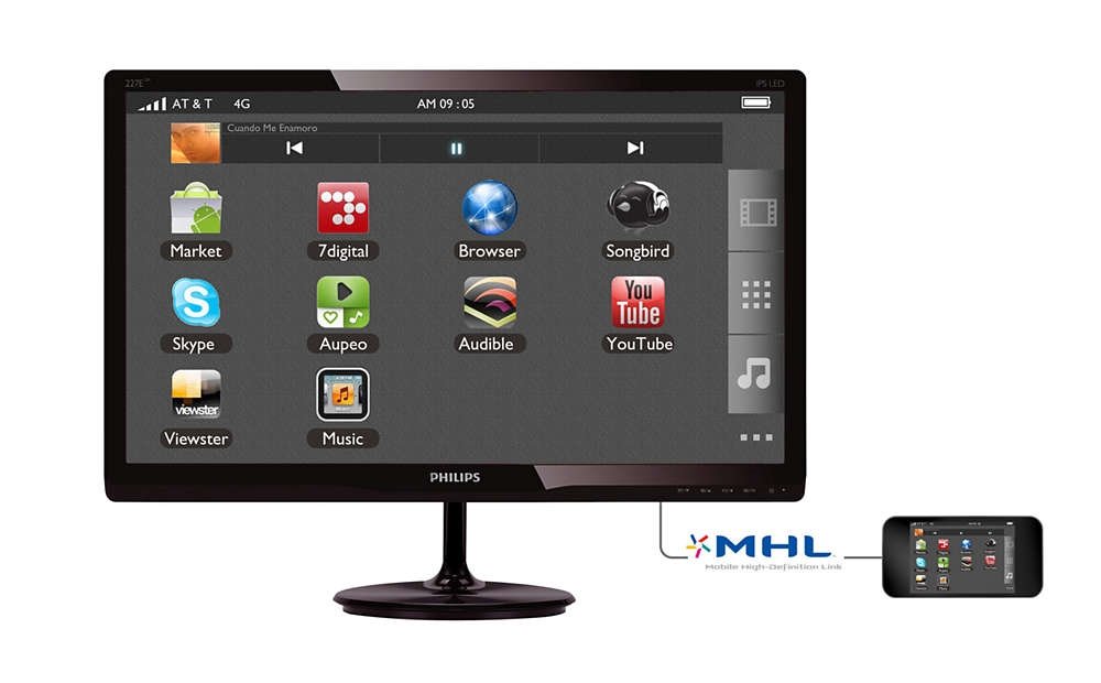 Mobile High Definition Link (MHL) to mobilny interfejs audio/wideo do bezpośredniego podłączania telefonów komórkowych i innych urządzeń przenośnych do wyświetlaczy o wysokiej rozdzielczości. Opcjonalny przewód MHL umożliwia proste podłączenie urządzenia przenośnego obsługującego technologię MHL do dużego wyświetlacza Philips MHL i obserwowanie, jak filmy HD ożywają dzięki cyfrowemu dźwiękowi. Można teraz czerpać przyjemność z gier, zdjęć i innych aplikacji na dużym ekranie, a jednocześnie ładować swoje urządzenie przenośne, aby nie zabrakło w nim energii.