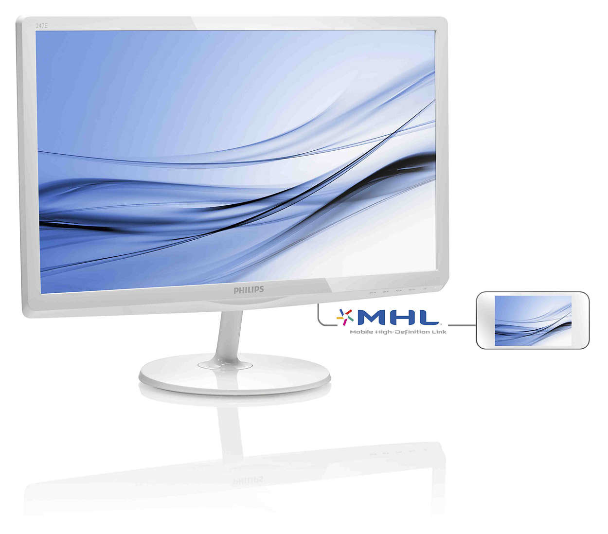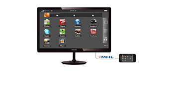 | Technologia MHL umożliwia oglądanie zawartości urządzeń przenośnych na dużym ekranie Mobile High Definition Link (MHL) to mobilny interfejs audio/wideo do bezpośredniego podłączania telefonów komórkowych i innych urządzeń przenośnych do wyświetlaczy o wysokiej rozdzielczości. Opcjonalny przewód MHL umożliwia proste podłączenie urządzenia przenośnego obsługującego technologię MHL do dużego wyświetlacza Philips MHL i obserwowanie, jak filmy HD ożywają dzięki cyfrowemu dźwiękowi. Można teraz czerpać przyjemność z gier, zdjęć i innych aplikacji na dużym ekranie, a jednocześnie ładować swoje urządzenie przenośne, aby nie zabrakło w nim energii. |