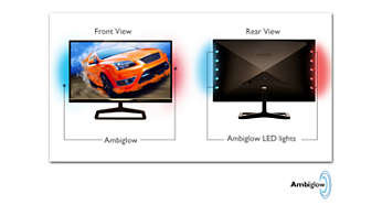 uzyskać poświatę, która potęguje wrażenia 3D Innowacyjna technologia Ambiglow nadaje wrażeniom wizualnym magiczny wymiar. Powiększa obszar wyświetlania, emitując z tylnego panelu monitora podświetlenie na sąsiadującą ścianę. Szybki procesor analizuje sygnał wejściowy i nieustannie dostosowuje kolor i jasność światła do wyświetlanego na monitorze obrazu. Łatwe w obsłudze opcje pozwalają dostosować nastrój do własnych upodobań, a także zmniejszyć zmęczenie oczu. Technologia Philips Ambiglow, stworzona przede wszystkim z myślą o oglądaniu filmów i programów sportowych oraz graniu w gry 2D lub 3D, oferuje niepowtarzalne, bardziej realistyczne wrażenia podczas oglądania. |