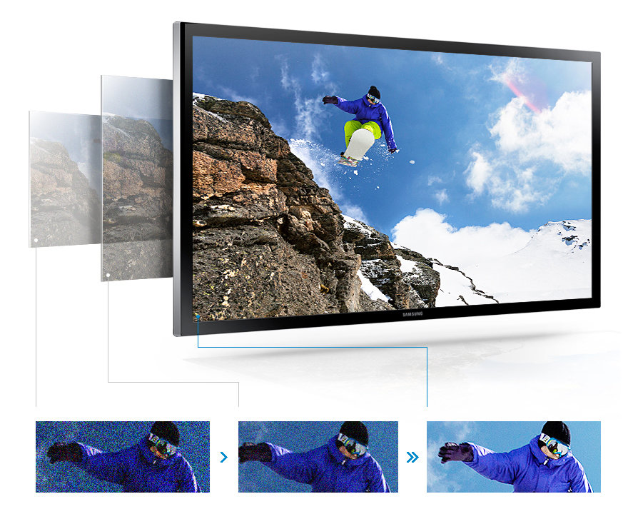 skalowania do rozdzielczości UHD Monitory Samsung UHD wyposażono w zaawansowany procesor obrazu, który poprawia jakość materiałów, niezależnie od ich źródła. Technologia ta automatycznie wykrywa rozdzielczość sygnału źródłowego, by później zredukować szumy i podnieść jakość. Oznacza to, że nie tylko materiały w standardzie UHD wyświetlane są w zachwycająco ostrej rozdzielczości 4K, lecz także te o niższej jakości osiągają poziom bliski standardowi Ultra High Definition. |