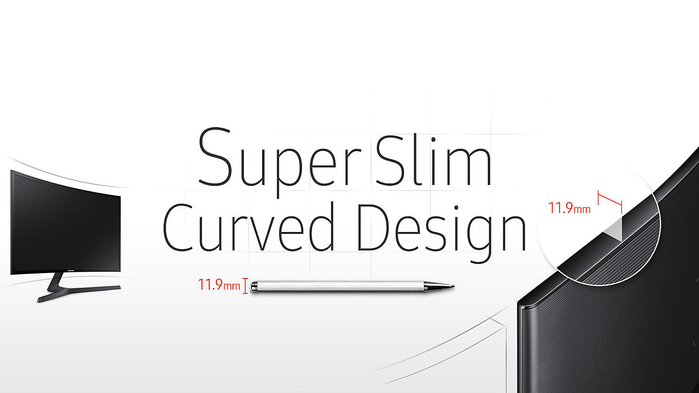 | Niezwykle cienki ekran i stylowy współczesny design Niezwykle cienki ekran: Zaskakująco smukły monitor ma tylko 11,9 mm grubości, czyli tyle co długopis. Oznacza to, że jest ponad dwukrotnie cieńszy od poprzednich zakrzywionych modeli. |