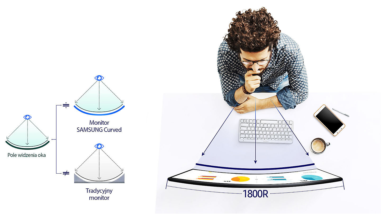 Ekran Samsung o zakrzywieniu 1800 R o wiele naturalniej dopasowuje się do zakresu pola widzenia ludzkiego oka niż zwykły, płaski monitor. Dzięki temu łatwiej można skupić spojrzenie i śledzić akcję wyświetlaną na monitorze. Wszystko to przekłada się na większy komfort oglądania i mniejsze zmęczenie wzroku, co zostało potwierdzone w badaniach klinicznych przeprowadzonych przez Wydział Okulistyki Narodowego Szpitala Uniwersyteckiego w Seulu.