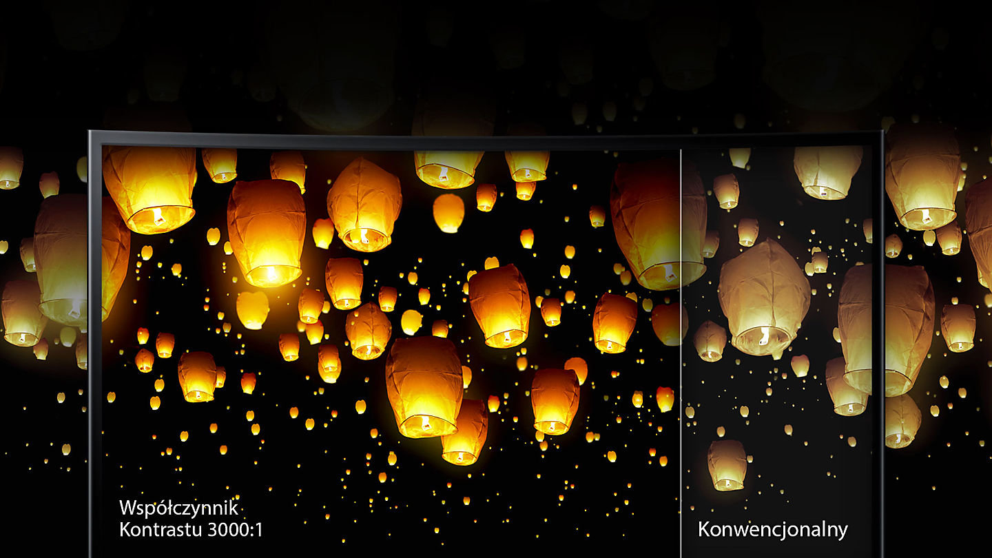 - Technologia Samsung redukuje wyciek światła i zapewnia bardziej jednolitą czerń na całej powierzchni ekranu.