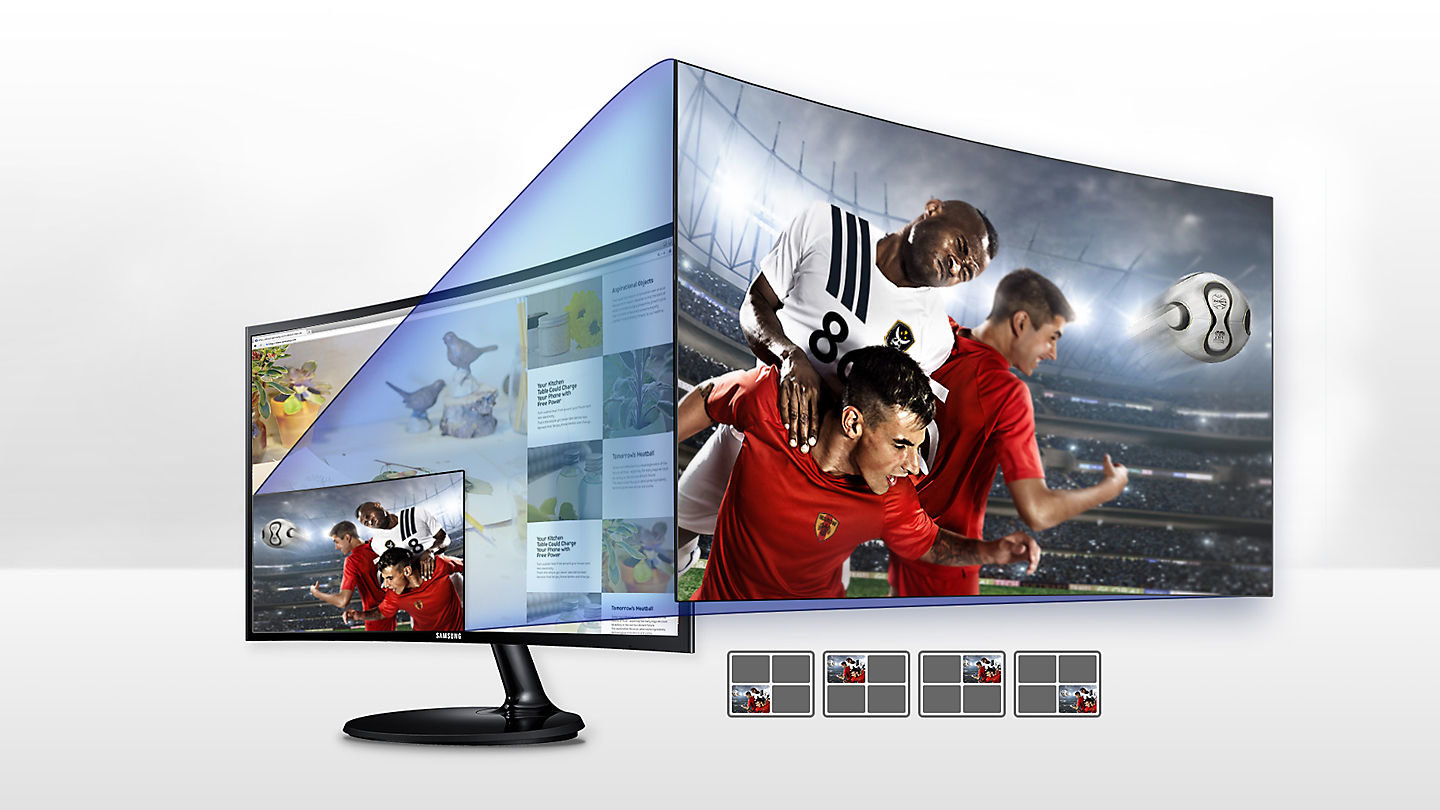 Odkryj zakrzywiony monitor Samsung, który wciąga Cię w sam środek akcji jak mało który. Zobacz różnicę w polu widzenia i poczuj się jak w kinie IMAX. Promień łuku krzywizny ekranu to aż 1800 mm, co stwarza naprawdę szerokie pole widzenia i zwiększa percepcję głębi. Zakrzywienie sprawia, że elementy z zewnątrz nie rozpraszają Twojego wzroku. Możesz więc z jeszcze większą przyjemnością oddać się rozrywce - grze lub ulubionemu filmowi w internecie.