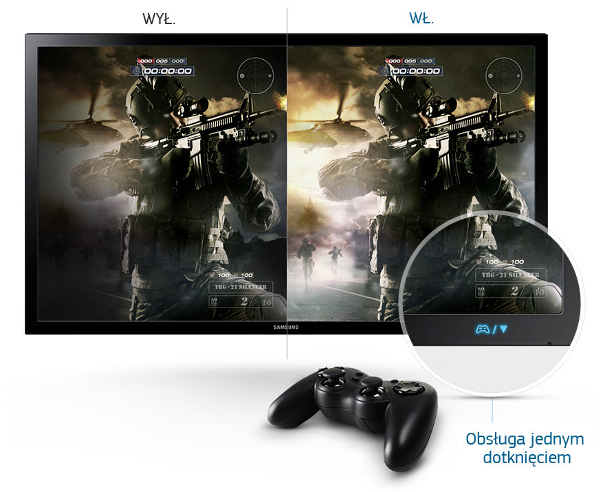 za jednym naciśnięciem przycisku Naciśnij przycisk, a uzyskasz parametry ekranu idealnie dostosowane do gier. Tryb gier natychmiast zmienia ustawienia monitora, tak aby zapewnić optymalne doznania podczas grania. Inteligentnie wykrywa on zmiany rodzaju wyświetlanego obrazu, wzmacniając kolory i zmieniając kontrast, aby uwydatnić ciemne elementy i rozjaśnić jasne punkty ekranu, zapewniając pełny pogląd akcji przez cały czas. Opóźnienie obrazu jest mniejsze za sprawą krótkiego czasu odpowiedzi, dzięki czemu możesz mieć pewność, że obraz nadąży za akcją i nigdy cię nie zawiedzie. |