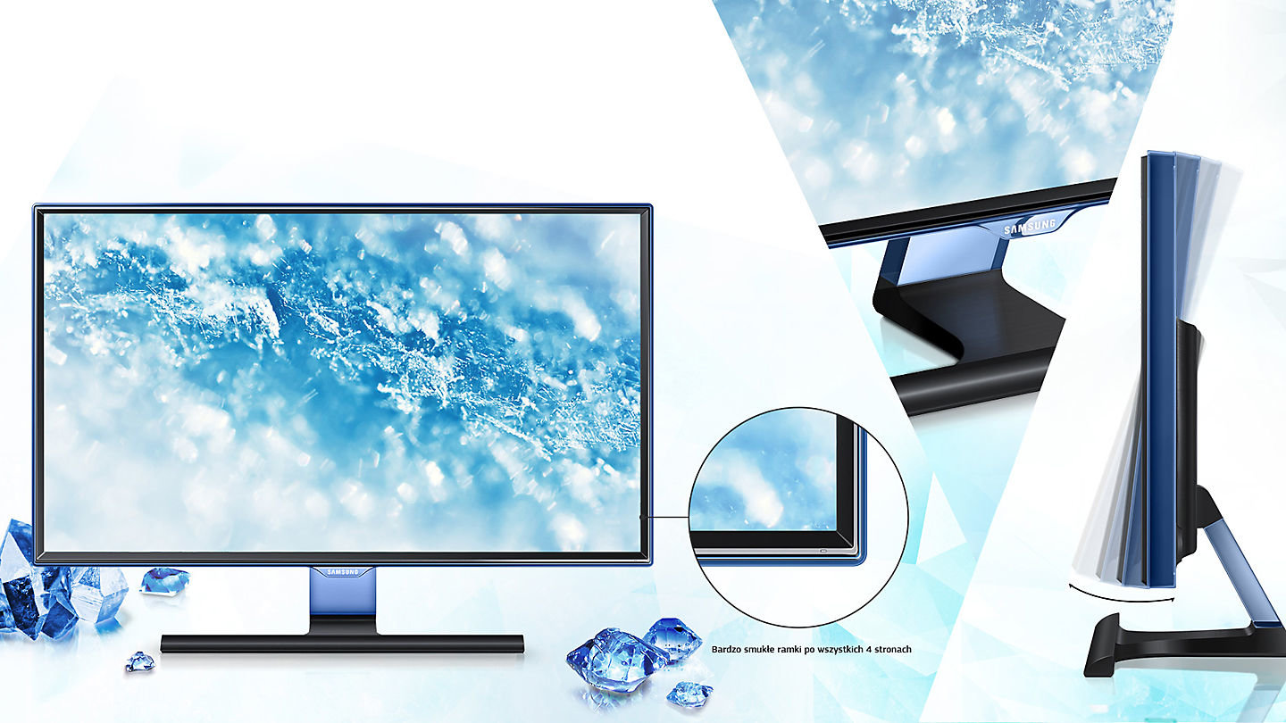 | Wyróżniający się wzornictwem Linia monitorów Samsung Touch of Color wyróżnia się nieszablonowym, przykuwającym wzrok designem. Zabarwione na niebiesko przezroczyste elementy obudowy dodają monitorowi lekkości, a wąska ramka pomaga skupić się na obrazie. Całość podkreślona jest przez elegancką podstawę w ksztalcie litery T. |
