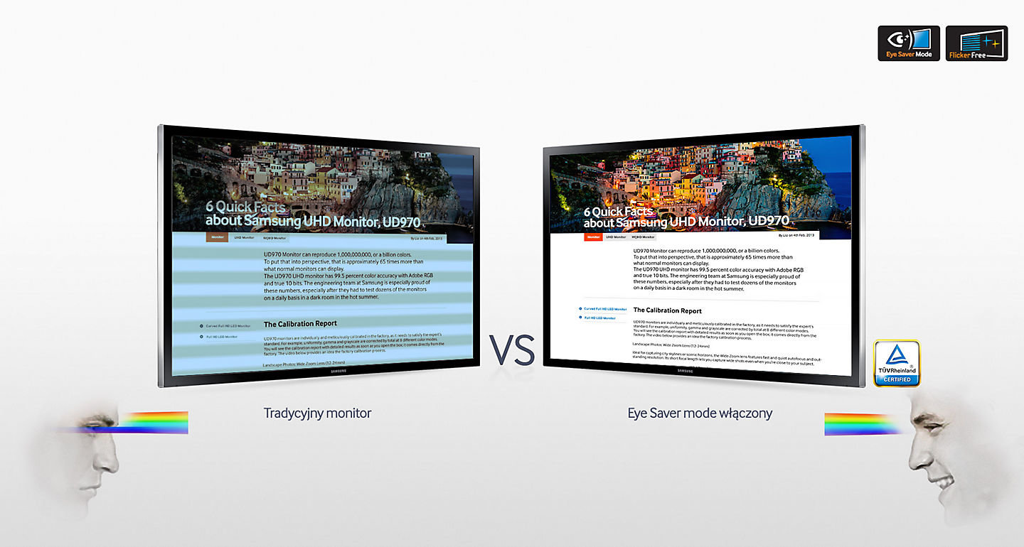 | Pozwól odpocząć oczom Od teraz praca i rozrywka staną się znacznie przyjemniejsze - nawet po wielu godzinach. Tryb Eye Saver redukuje emisję męczącego wzrok światła niebieskiego. Z kolei technologia Flikcer Free chroni Twoje oczy eliminując migotanie ekranu obecne w tradycyjnych monitorach. Zadbaj o swój komfort i zdrowy wzrok. |