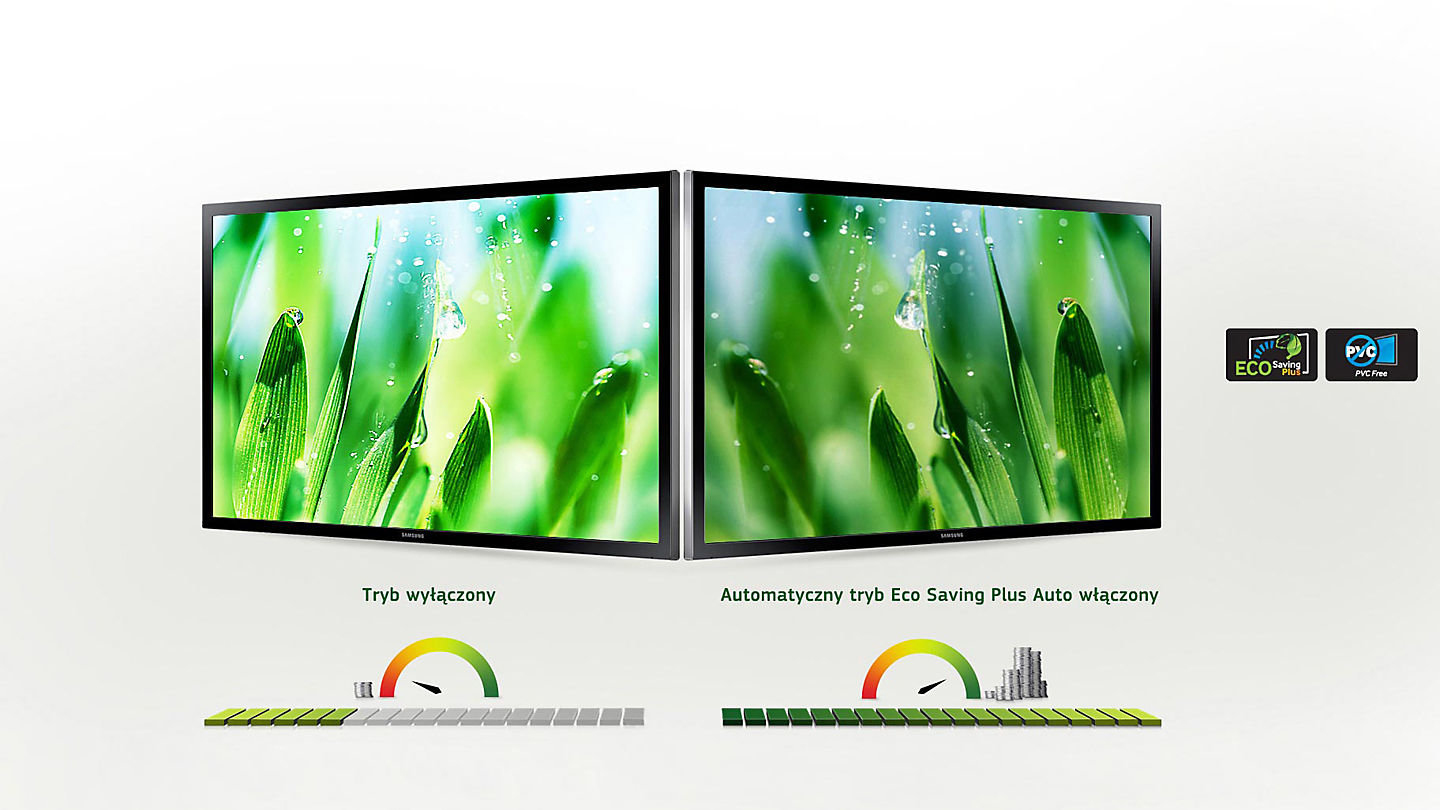 | Przyjazny dla środowiska Technologia Eco Saving Plus pozwala zmniejszyć zużycie energii poprzez obniżenie jasności ekranu o 25%, 50% lub, w nowym trybie automatycznym, o około 10%*. Monitor wykonano także z materiałów nie zawierających PCW**, dzięki czemu jest on przyjazny dla środowiska naturalnego. *Na podstawie testów wewnętrznych. **Część okablowania zawiera OCW. |
