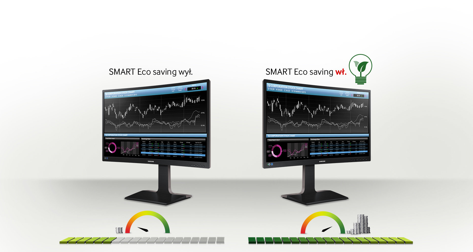 | Łatwiejsze oszczędzanie energii Tryb SMART Eco Saving zmniejsza zużycie energii o 10%, nie wpływając negatywnie na jakość obrazu. W trybie tym jasność czarnych obszarów i intensywność kolorów ustawiane są automatycznie. Możesz również ustawić, po jakim czasie bezczynności monitor ma się automatycznie wyłączyć. Monitor, jako pierwszy na świecie, nie zużywa energii w trybie wyłączonym (0,00W). To przełomowe osiągnięcie uzyskało certyfikat Intertek. |