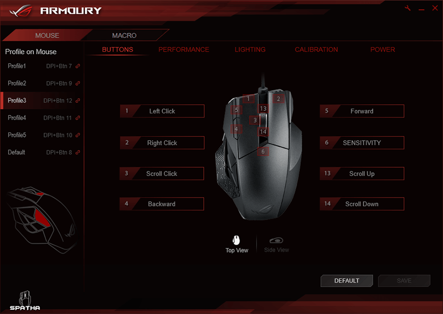 SZEŚĆ PROGRAMOWALNYCH PRZYCISKÓW W ZASIĘGU KCIUKA Mysz ROG Spatha w zasięgu kciuka posiada programowalne przyciski z przełącznikami Alps®, które zapewniają miłe wrażenia dotykowe. Sześć przycisków rozmieszczono na wzór kultowego oka ROG oraz zaprojektowano tak, aby zapewnić intuicyjną kontrolę i odczucia. |