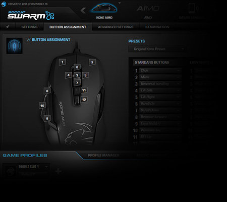 Oprogramowanie Swarm stanowi ucieleśnienie filozofii ROCCAT®, w myśl której staramy się być o jeden krok naprzód. Jest to system najnowszej generacji, który obejmuje wszelkie liczące się platformy i urządzenia do grania, a także stanowi jednolity ośrodek gier, aplikacji i produktów ROCCAT®, zapewniając zaawansowaną integrację produktów i uniwersalny węzeł ze sterownikami do wszystkich urządzeń ROCCAT®. Pożegnaj dziesiątki ikon na pasku zadań – dzięki Swarm otrzymasz skuteczne centrum dowodzenia, z którego możesz zarządzać każdą bronią w Twoim arsenale.