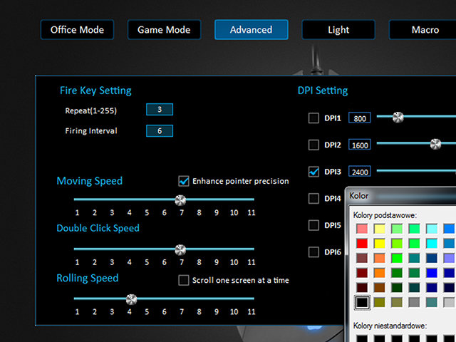 OPROGRAMOWANIEMysz również jest wyposażona gamingowe oprogramowanie oferujące szeroką gamę funkcji, które można przypisać do jednego z 6 programowalnych przycisków. W oprogramowaniu można ustawić takie funkcje jak: rozdzielczość DPI, szybkość podwójnego kliknięcia, szybkość przewijania rolki, funkcje multimedialne, przycisk Fire, nagrywać dowolne makra i inne. | |