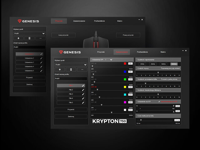 | DEDYKOWANE OPROGRAMOWANIEKrypton 750 dzięki zaawansowanemu oprogramowaniu pozwala na precyzyjną konfigurację parametrów oraz przypisanie licznych ustawień do profili. Zmieniaj czułość DPI, dostosuj wielokolorowe podświetlenie RGB, twórz i zapisuj makra i konfiguruj każdy z 6 przycisków programowalnych! Graj na własnych zasadach i zapewnij sobie najlepsze wyniki! |