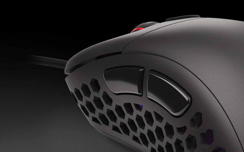 Otwory w myszce nie tylko obniżają wagę gryzonia, ale również zapewniają wyróżniający się design. Smukła sylwetka wraz z efektownym, konfigurowalnym w oprogramowaniu podświetleniem RGB dostępnym w 9 trybach nadaje niepowtarzalnego klimatu Twojemu stanowisku.