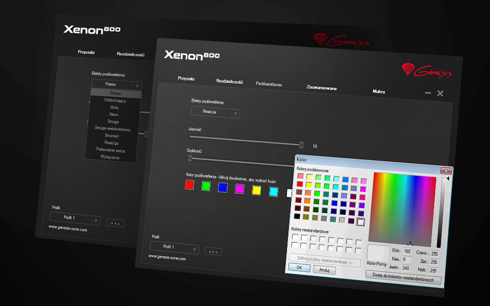 ZAAWANSOWANE OPROGRAMOWANIEXenon 800 pełne możliwości osiąga z dedykowanym oprogramowaniem, które pozwala w języku polskim lub angielskim dostosować funkcjonowanie przycisków, skalibrować podświetlenie RGB oraz skonfigurować profile i makra. Mysz posiada wbudowaną pamięć, dzięki której zachowasz zapisane ustawienia nawet po podpięciu jej do innego PC.  |      |