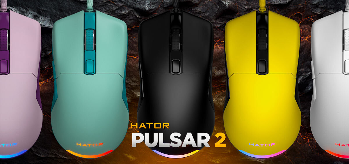 Mysz HATOR Pulsar 2 w kolorze liliowym, zestaw ślizgaczy 100% PTFE, instrukcja obsługi.