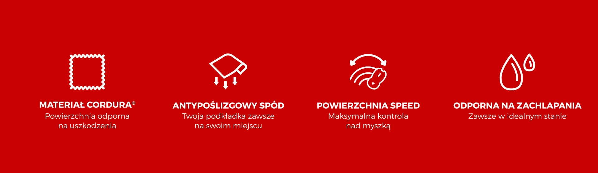 ![]() | ODPORNOŚĆ NA WODĘPowierzchnia Carbon 700 jest w pełni odporna na wodę i zapobiega wchłanianiu cieczy, co sprawia, że podkładka pozostanie w nienaruszonym stanie nawet po zalaniu płynem. Postaw swój ulubiony napój na stanowisku i oddaj się emocjonującej rozgrywce! |