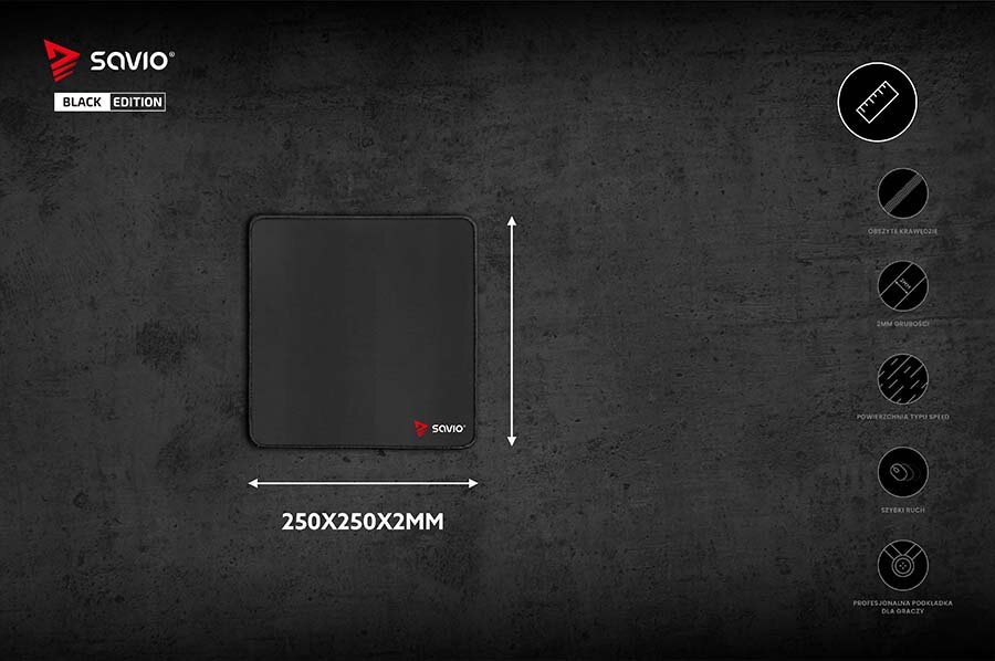 Wersja podkładki S ma wymiar 250x250x2mm, a jej antypoślizgowa podstawa zapobiega przesuwaniu się podczas użytkowania. Zastosowana wysokiej jakości guma oraz jej faktura daje gwarancję, że podkładka Savio będzie zawsze leżała na swoim miejscu, nawet podczas intensywnych rozgrywek.