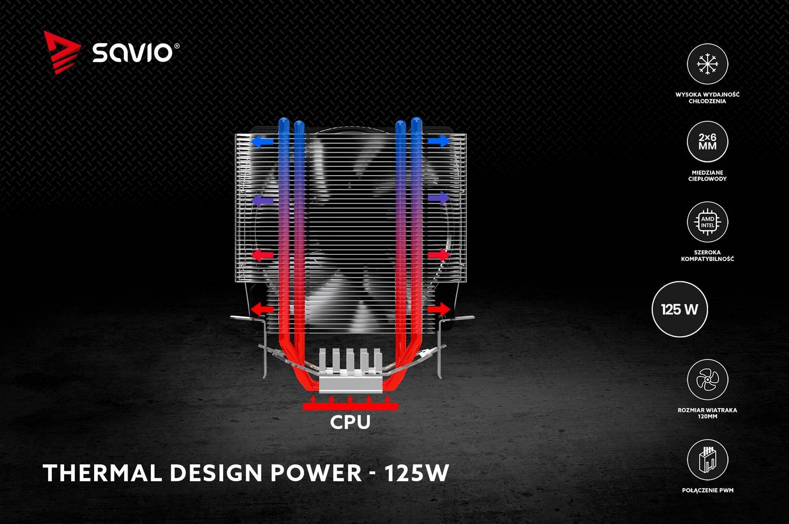 Chłodzenie SAVIO FROST dostosowane jest do obsługi nowoczesnych procesorów. Wydajność chłodzenia osiąga imponujące 125 W TDP (Thermal Design Power). Z łatwością poradzi sobie ze schłodzeniem większości modeli CPU dostępnych na rynku, a co za tym idzie, w odczuwalny sposób poprawia użytkowanie komputera. Ponadto dzięki zastosowaniu odpowiednich materiałów poddanych licznym wymagającym testom, chłodzenie gwarantuje bezawaryjną pracę i długi okres eksploatacji.