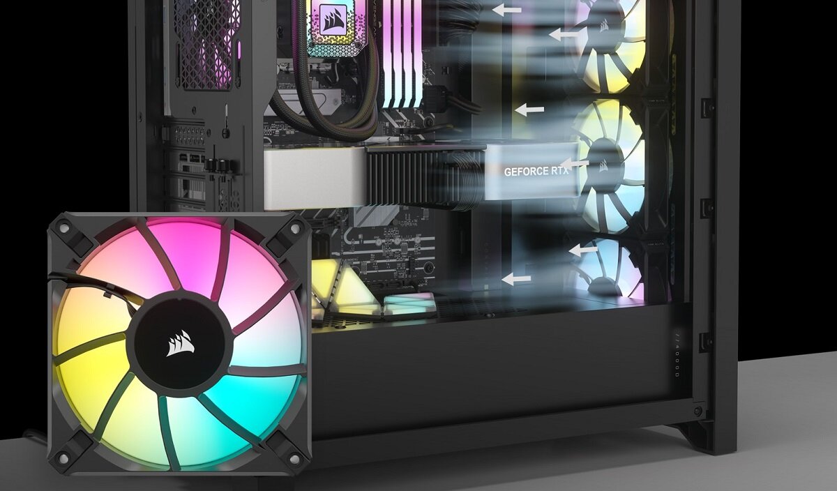 Wentylator ma inteligentny system oświetlenia RGB, który umożliwia wybór 8 różnych efektów świetlnych, w tym pulsowania, migania, rzeczywistego światła i wielu innych. Dodatkowo, dzięki możliwości sterowania oświetleniem za pomocą aplikacji iCUE, użytkownik ma możliwość kontroli nad kolorami i efektami wskaźnikami wentylatora.