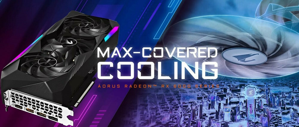 Uzyskanie tak dobrych parametrów pracy przez kartę graficzną GIGABYTE Radeon RX 6800 XT Aorus Master nie byłoby możliwe, gdyby nie rozbudowany system chłodzenia tej platformy sprzętowej. Składa się on z trzech odrębnych wentylatorów, które generują równomierny strumień chłodnego powietrza na całą strukturę karty. Ich zaletą jest odpowiednio wyprofilowany kształt, dzięki któremu powietrze intensywnie schładza kartę już przy niewielkiej prędkości obrotowej.
