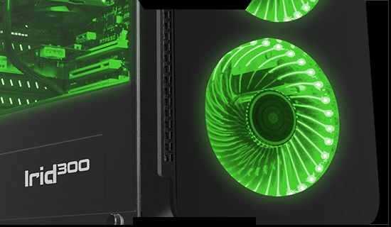 Pierwszy rzut oka do wnętrza Irid 300 i już niespodzianka – w obudowie zainstalowano cztery wysokiej jakości wentylatory. Co więcej, każdy z nich posiada podświetlenie LED, generowane przez 33 diody. Jakby tego było mało, gracz może zamontować dodatkowe trzy wentylatory na górze obudowy, dla poprawy efektywności chłodzenia. W Irid 300 znajdzie się też miejsce dla chłodzenia cieczą.