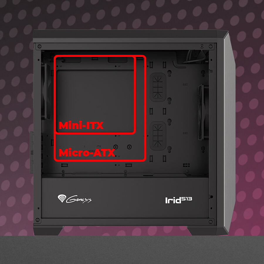 MAŁA A TAK WSZECHSTRONNAGenesis IRID 513 nie ogranicza Cię, bez problemu zamontujesz w niej 3 dyski SSD oraz 1 dodatkowy HDD. Nie chcesz ograniczać się do jednego standardu płyty głównej? W IRID 513 zmieścisz zarówno micro-ATC jak i mini-ITX.