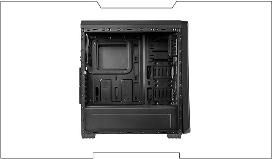 W głównej komorze obudowy znajdziemy przestrzeń do wygodnego zamontowania i rozmieszczenia poszczególnych podzespołów. Obudowa posiada zatoki do dysków 2x 5.25”, 2x 3,5” oraz 2x 2,5”, a także możliwość instalacji karty graficznej o długości do 380 mm. Dodatkowo w tylnej części znajdziemy przestrzeń dostosowaną do organizacji kabli i aż 7 gniazd rozszerzeń.