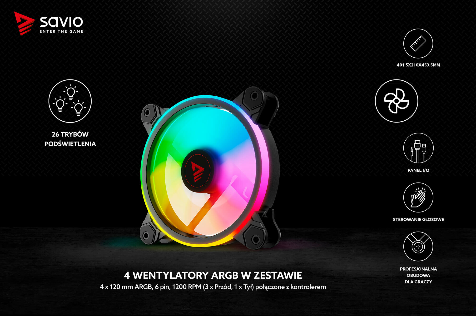 Obudowa SAVIO Prime X1 została wyposażona w aż 4 sztuki adresowalnych 6-pinowych wentylatorów ARGB o wymiarze 120mm i prędkości 1200RPM, które są doskonale widoczne przez dwa szklane panele. Trzy sztuki wentylatorów znajdują się zaraz za szklanym przednim panelem, natomiast jeden z tyłu obudowy. Wentylatory komunikują się za pomocą zaawansowanego kontrolera adresowalnego podświetlenia LED ARGB.
