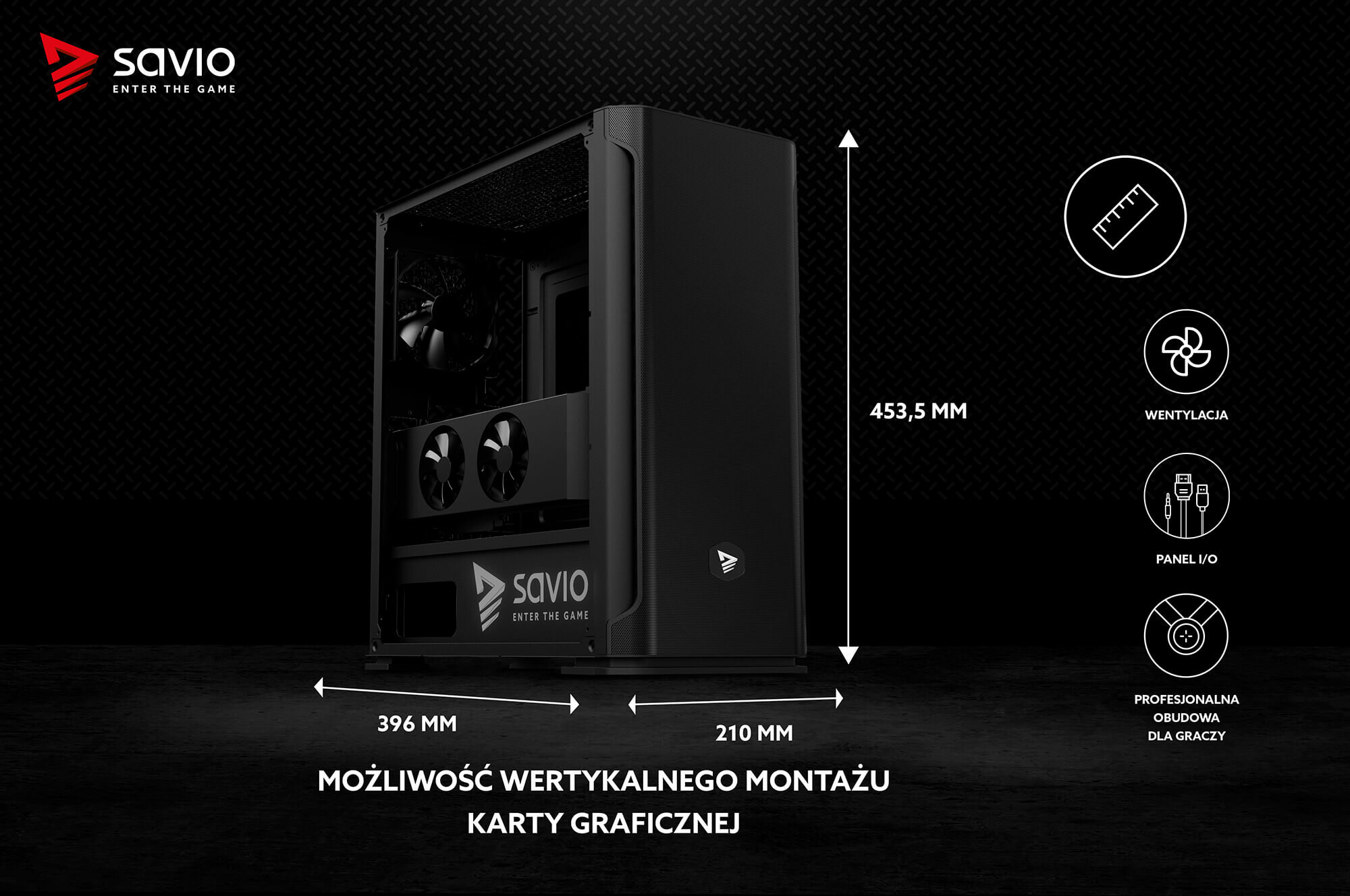 Wymiary obudowy 401.5 x 210 x 453.5 mm SAVIO Shadow X1 z frontowym panelem typu MESH zapewnia idealne chłodzenie CPU, GPU i pozostałych komponentów.